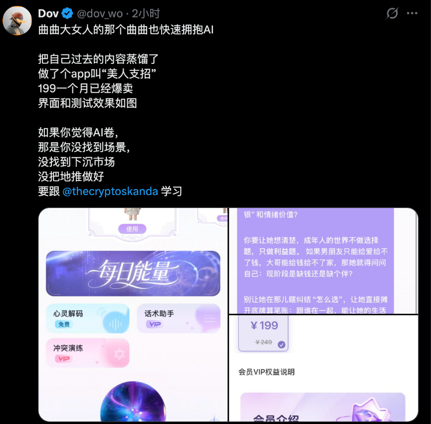 已有成功案例验证了这一路径:名医、KOL 等将自身专业知识和内容蒸馏成 Agent,用户无法约见真人时可先用 Agent。如某自媒体从业者将自己过去的内容蒸馏成 App,月费 199 元,销售表现优异——与其连麦 15 分钟需大几千甚至上万人民币,而使用其 Agent 版本只需几十到几百元。