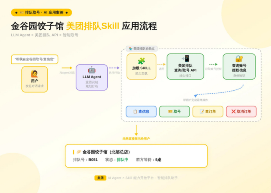 金谷园饺子馆 skill 背景故事: 「2026 年 4 月 7 日,在 OpenClaw 火爆的背景下,饺子馆的老板编写了一个名为 ‘金谷园饺子馆·SKILL’ 的 AI 能力模块。这款 AI 技能是面向 AI Agent 而非直接面向人类的,安装后,AI 助手便能自主查询菜品信息、营业时间、排队规则,甚至实现在线取号。2025 年冬至因排队人数过多,导致外卖平台服务器将门店接口误判为异常并封禁,老板希望通过 AI 优化未来的排队体验。」