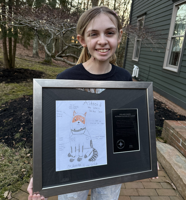 在 SpaceX 后续的 Polaris 项目中,她被邀请参与设计任务中的「零重力指示物」。这是一个会在飞船进入失重状态时漂浮起来的小玩偶,用于标志进入太空。Liv 在短时间内完成了设计——一只名为 Asteroid 的毛绒小柴,灵感来源于她对太空的想象以及对可爱形象的喜爱。