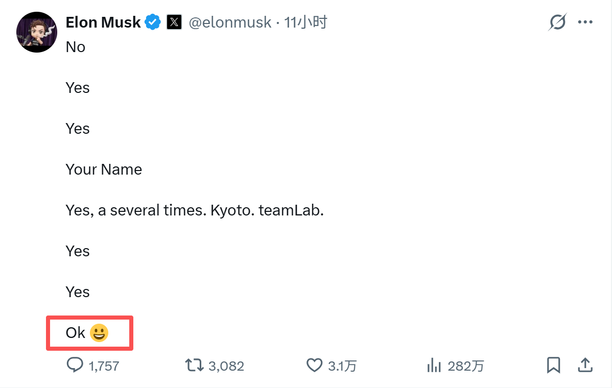尤其是最后一个问题「您能否让 Asteroid 成为 SpaceX 的吉祥物?」一举点燃了链上相关 Meme 的热度。