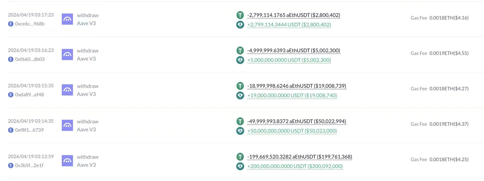 官方在 4 月 18 日 18:52 UTC 开始冻结所有部署的 rsETH/wrsETH 市场,HTX Recovery 地址在 19:13、19:14、19:15、19:16、19:17 UTC 连续从 Aave Pool V3 发起 5 笔 withdraw,5 分钟内把接近 3 亿美金 USDT 麻溜提完,毫不留情。