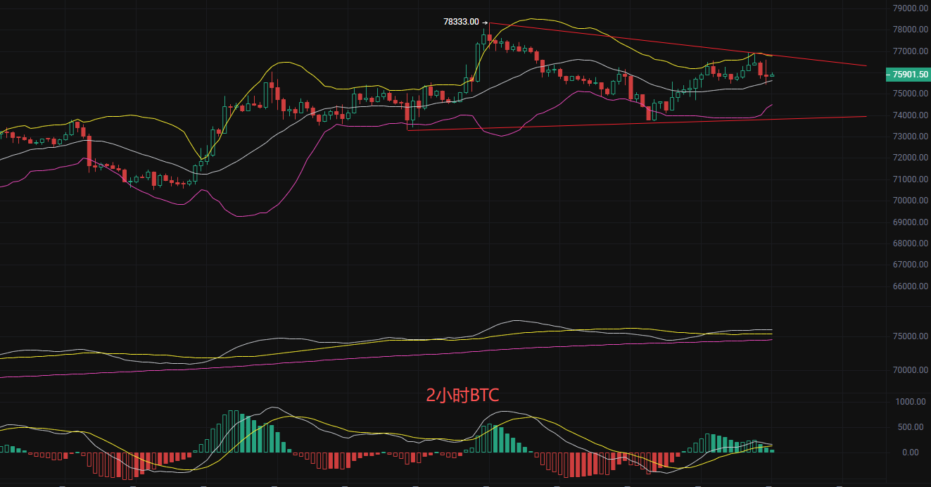 家人们!比特币现价75900,正处于短期走势的关键抉择点。目前围绕布林带中轨进行窄幅震荡。布林带呈收口态势,表明市场波动性收缩,酝酿新的方向性突破。从均线系统看,短期均线MA7与中期均线MA30持续纠缠,方向性指引不强,但MA120仍保持稳定上行,为价格提供深层支撑。当前价格上方的主要阻力区域在76500-77000,而下方关键支撑位于75000美元整数关口及布林带下轨附近。整体结构呈现收敛三角形整理特征,价格运行空间不断被压缩,变盘临近。