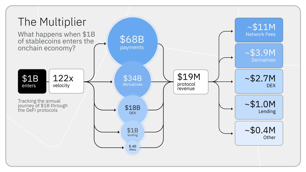 每当有 10 亿美元全新稳定币铸造并进入链上经济,这笔资金会分散至金融体系各类头寸,一年内被复用超百次,每年创造数千万美元收益。