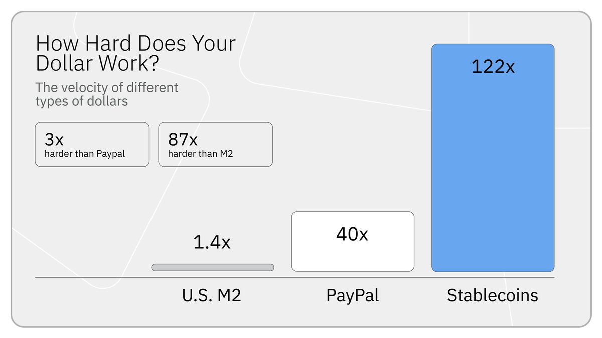 每 10 亿美元稳定币,可撬动约 1220 亿美元 的年度经济活动,资金流通速率高达 122 倍。相比之下,PayPal 美元年周转次数约 40 次,美国广义货币 M2 流通速率仅 1.4 倍。这意味着,链上 1 美元的使用效率,约为 PayPal 体系的 3 倍、美国 M2 货币的 87 倍。究其原因:稳定币可在支付、兑换、借贷等场景无限循环流转,而传统资本受限于 T+1、T+2 结算系统,流转效率被严重束缚。