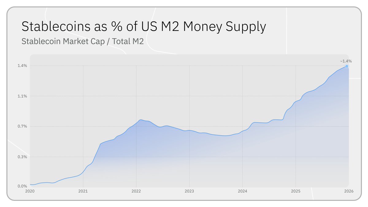 自 2020 年初至今,稳定币总供给增长约 60 倍,从 50 亿美元扩张至 3000 亿美元,当前规模约占美国 M2 货币总量的 1.4%。仅 2025 年一年,新增铸造稳定币规模就超 1200 亿美元,这是有史以来最大的年度增幅。全年稳定币交易总额达 33 万亿美元。