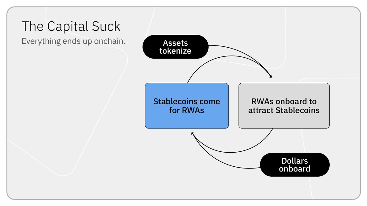 稳定币是首个大规模落地的链上现实资产。美元资金从银行账户迁入区块链,依靠飞轮效应持续沉淀、复利增长。笔者与 Spencer Bogart 认为,一场资本大迁徙正在上演:全球资本正从传统基础设施,系统性向链上转移。