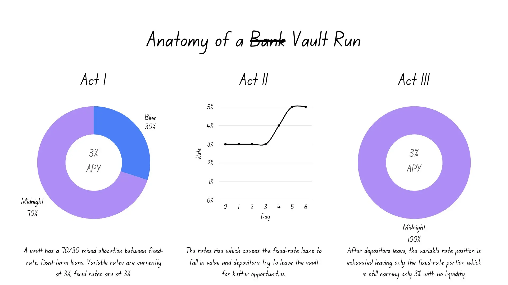 一次利率冲击将可变利率推高至5%,Midnight的头寸依旧锁定在3%。金库A的混合收益率升至3.6%(5%×30%+3%×70%)。纯可变利率的金库B则升至5%。这140个基点的落差便为金库挤兑创造了条件与动机。