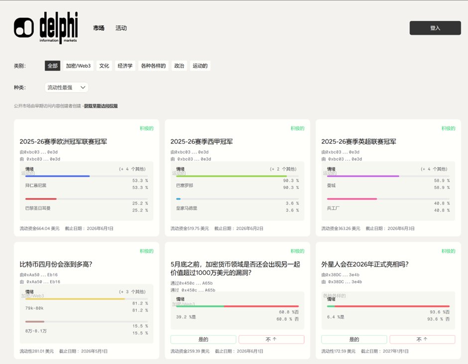 相比 polymarket 这类平台,散户可以在 delphi 创建市场并有机会获利,也可以通过 AI Agent 参与交易,玩法更丰富。