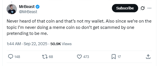 直到 2025 年 9 月份,随着 MrBeast 的钱包地址再次买进市场热门的 ASTER 代币,截至 10 月 1 日,MrBeast 共花费 168 万美元买了 95 万枚 ASTER。此举再次引发了社区关于他即将「喊单」的猜测。但这一次,MrBeast 的反应出乎所有人的意料。面对社区的讨论,他公开发表声明,直接否认了这笔投资,称他「从未听说过这个币」,并且「那不是他的钱包」 。
