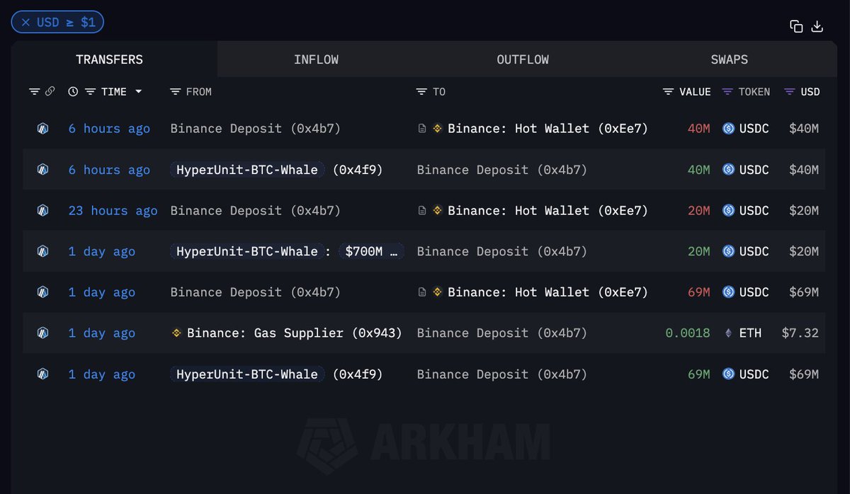 $10B HYPERUNIT 巨鲸将 $100M 转入币安