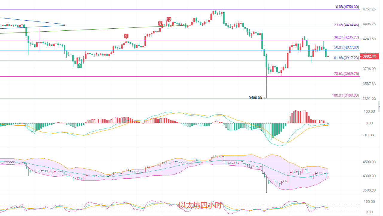 日K线发稿前最高4216,最低3926,已经跌破了236一线又跌破了EMA90趋势线4030,现在开始冲击大级别支撑3866,大空趋势延续,南下不要全部清仓,留一点底仓,MACD缩量开始增筹,DIF和DEA收缩失败,布林带中规阻力位有效关注4245,主力连续所赐冲击失败回落,下轨关注3744