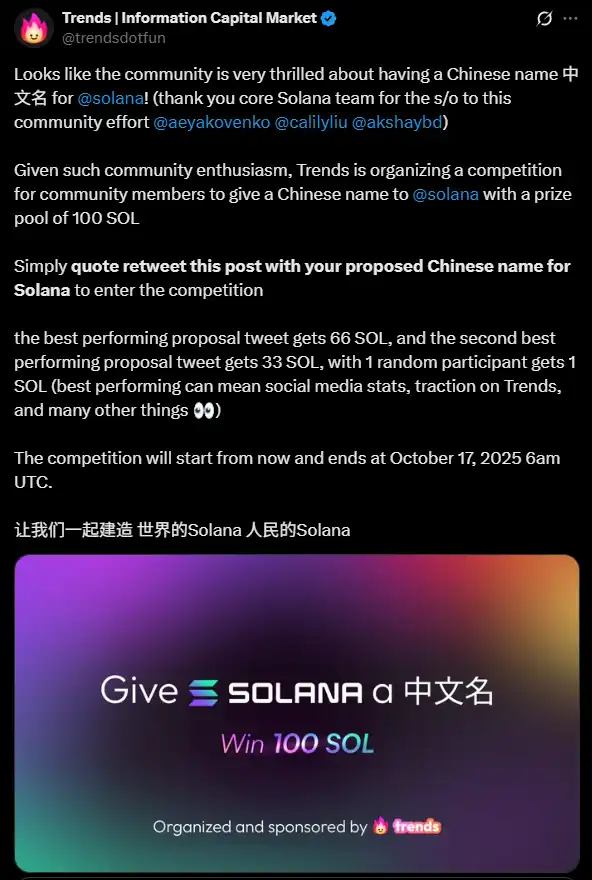这是个挺有意思的事,几天前,社交协议平台 Trends 启动「为 Solana 征集中文名」活动,同时为活动设置了 100 SOL 奖池。用户引用转发官方推文并写上为 Solana 提议的中文名即可参加。奖励规则为表现最佳的提案推文获得 66 SOL,第二名获得 33 SOL,另随机抽出 1 名参与者获得 1 SOL。毕竟现在中文 meme 情绪火爆,100SOL 的奖励也相当吸睛。