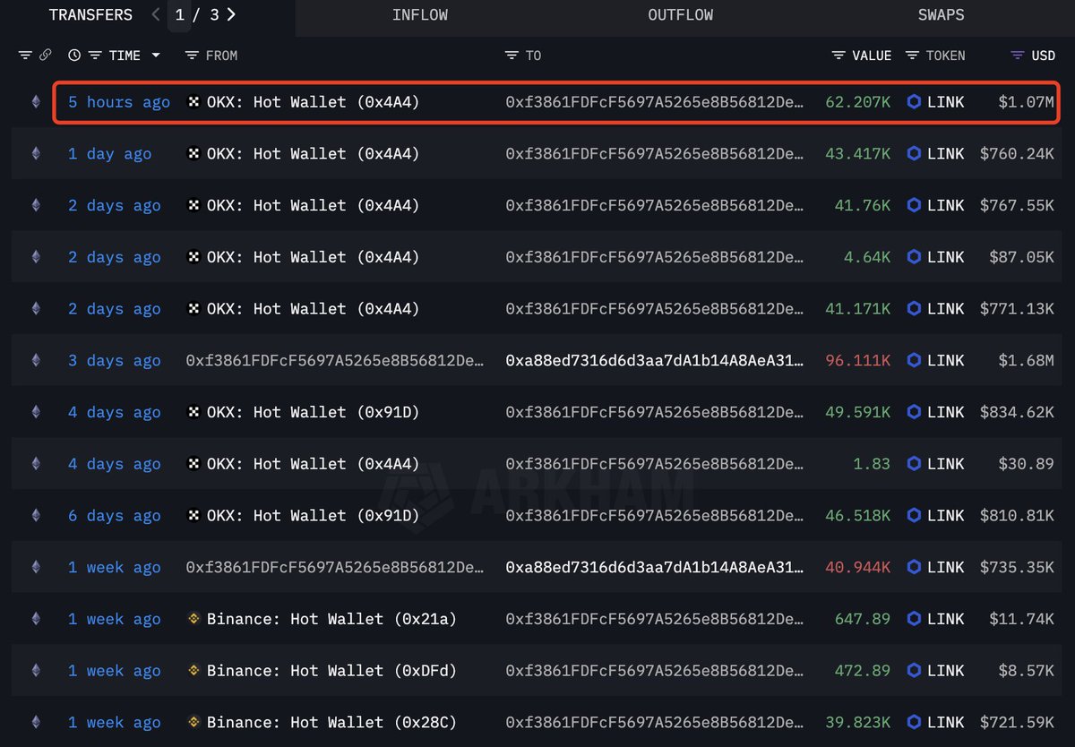 鲸鱼 0xf386 在 5 小时前从 #OKX 提取了 62,207 $LINK($1.07M)——在过去 5 个月中累计总计 1.1M $LINK($19M)。