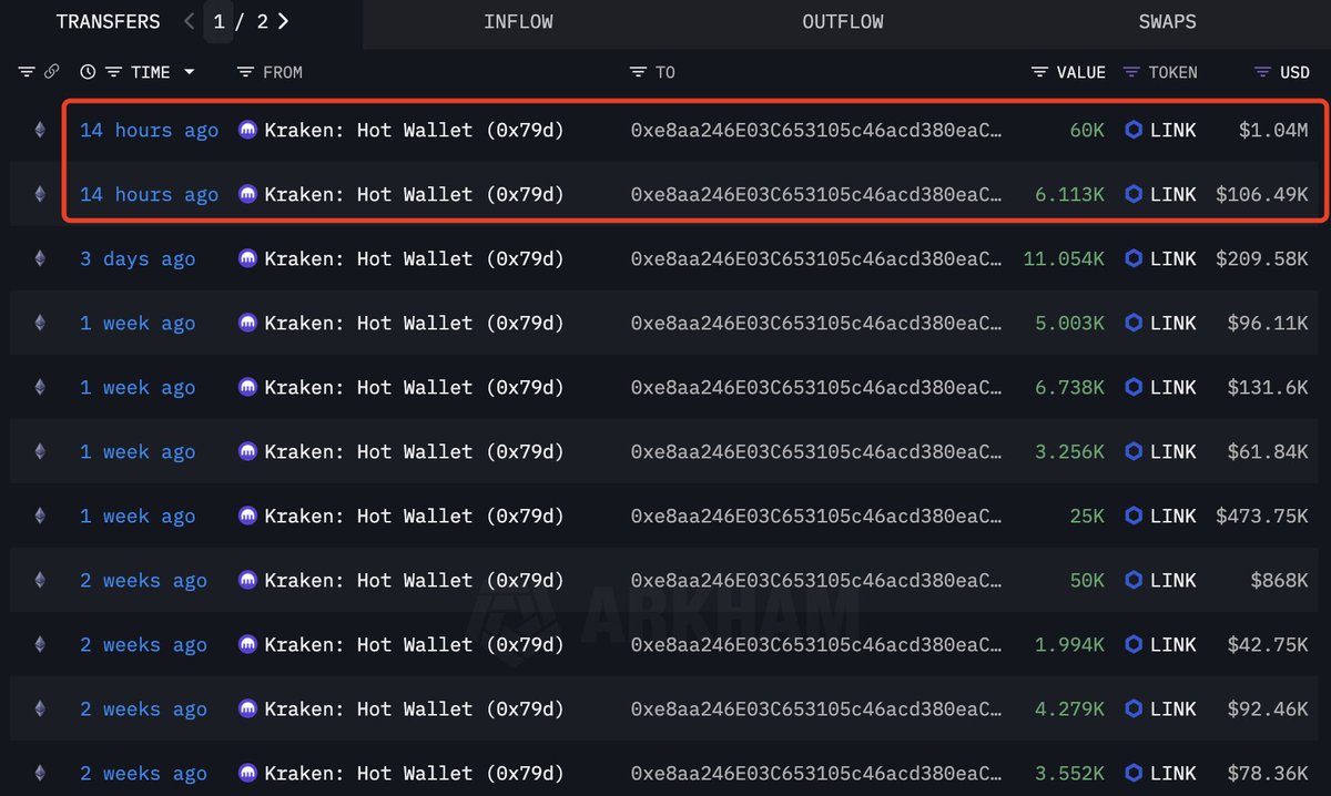 鲸鱼 0xe8aa 在 14 小时前从 #Kraken 提取了 66,113 $LINK($1.14M)——在过去一个月中累计总计 307,684 $LINK($5.34M)。
