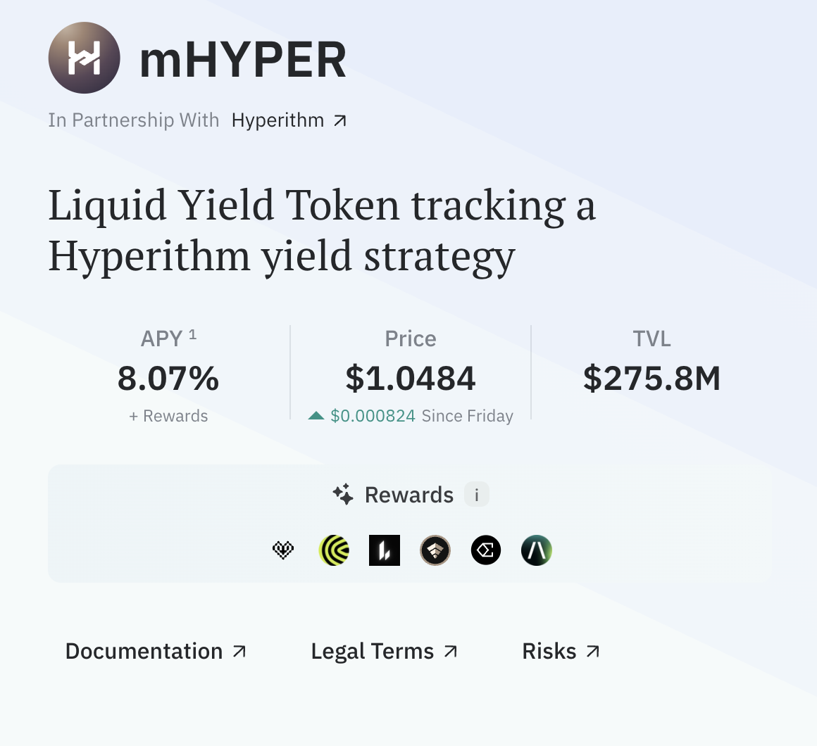 实在存不进去 Stable 的可以考虑下利用 Midas 的 mHYPER(传送门)财库间接参与 ——mHYPER 通过借贷给 Hyperithm 2500 万美元间接投入了 Stable 的预存款,资金存入该池后可共享收益。当前 mHYPER 财库的 APY 暂报 8.07%,另外还有一定的 Cap、Lighter、USDai、Ethena、Almanak 等热门协议的积分敞口。