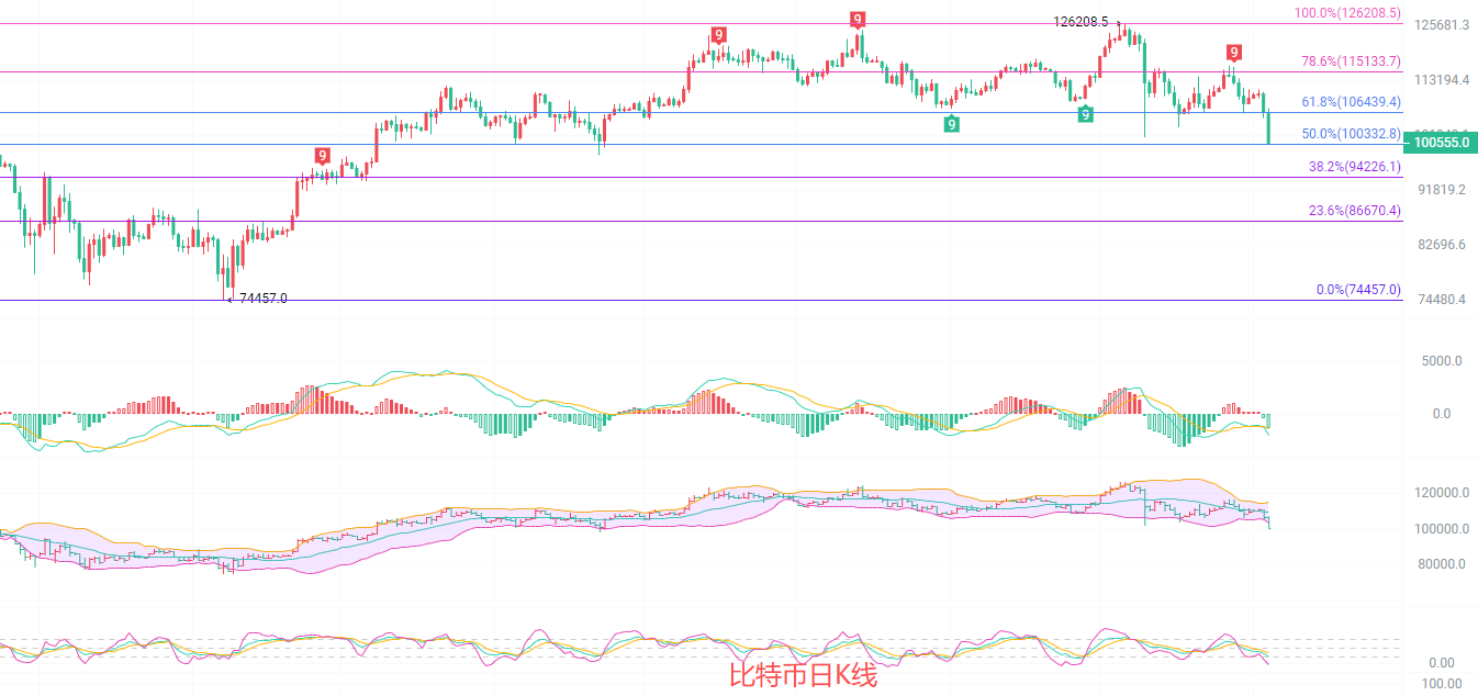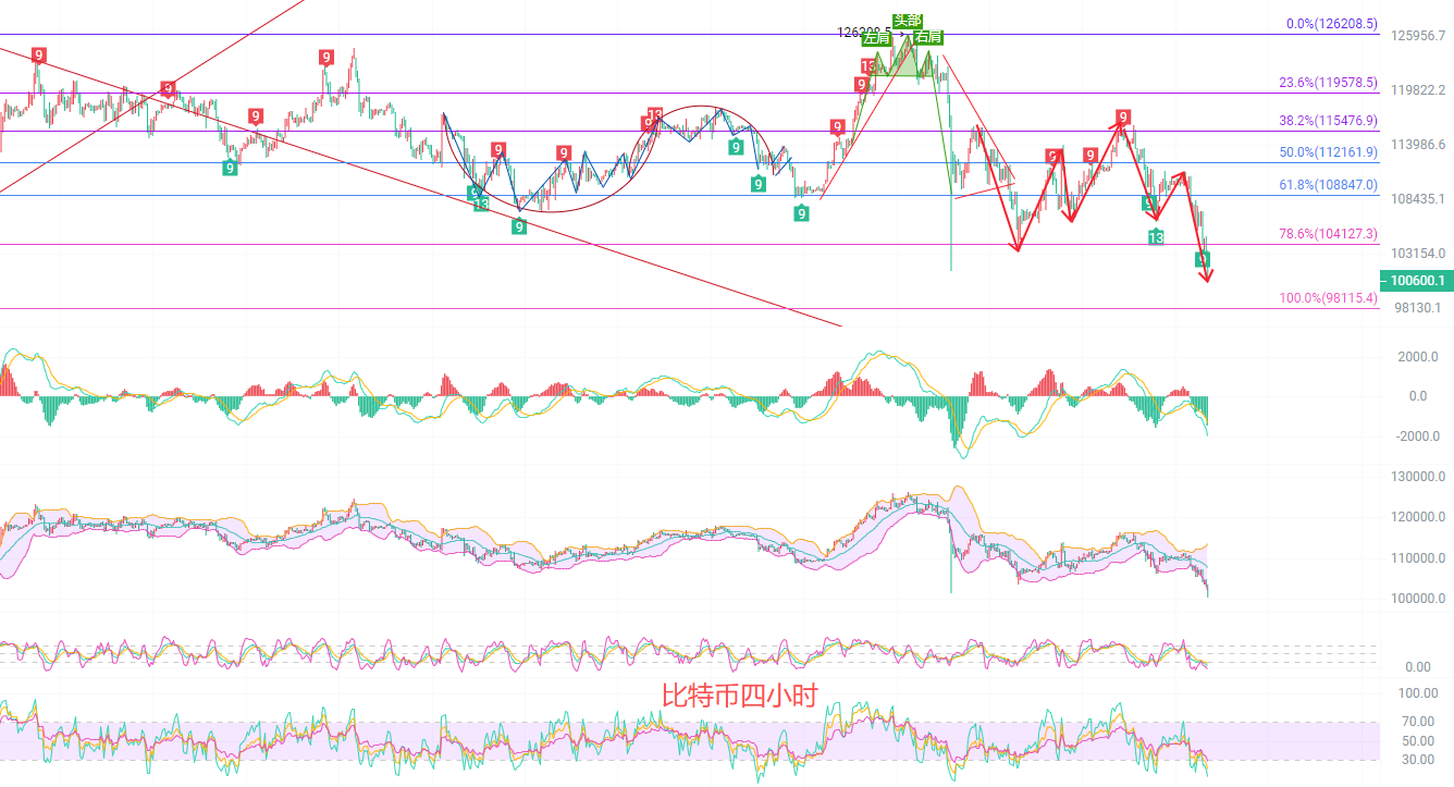 不看太远,来看目前的盘口,日K线发稿前最高107270,最低100585,黄金分割线支撑0.5一线在100333这个位置,现在就看十万关口了,主力会怎么选择,MACD缩量增筹,布林带向下开口扩散,下轨来到了103400,K线跌破下轨,预计会回到通道内围绕下轨扩散,暂时保住手中的筹码活下去,等回调以后继续南下,不回调不入场