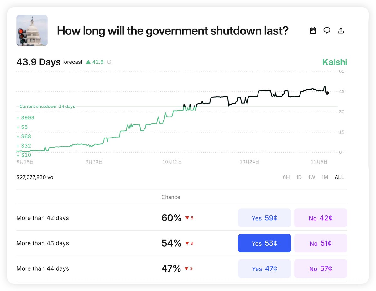 今天的下跌应该就是投资者对于美国政府停摆的悲观预期,北京时间11月5日 00:30 开始表决,结果是参议院第14次否决共和党主导的临时拨款案,再次投票的时间还没有确定。目前 Kalshi 中预测美国政府停摆的时间会是44天,这就意味着还要9天的时间。