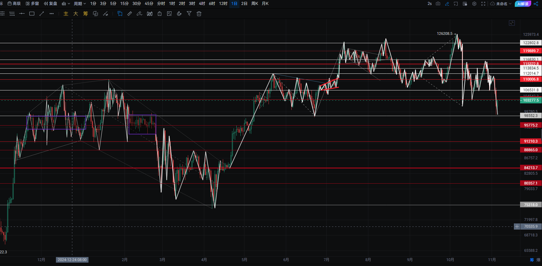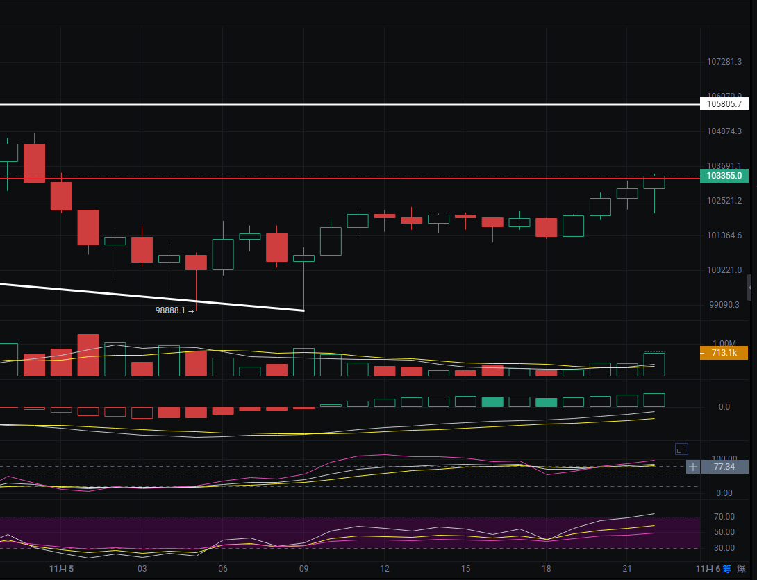 我们简单复盘一下日内行情走势,用11月4日夜盘十一点开始,以太是六小时连续带量排列的阴柱砸盘,价格从3580砸到3050一带,单日砸了五百点,而大饼在104800一带砸到98888这种嘲讽味极重的位置,砸了不到五千点。过程里夹杂了两道买入,交易量不少,可见有人围绕10w整关护盘。