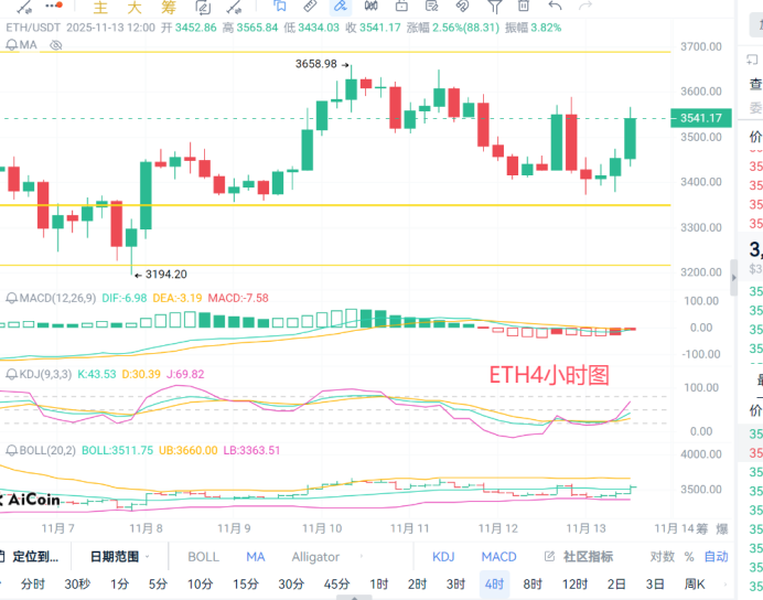日线级别处在箱体内,MACD量能低迷,KDJ向上散开,布林开口依然向下,受布林中轨3680一线压制。4小时级别MACD缩量上行,KDJ向上散发,布林开口平行,突破布林中轨,短线有可能会去冲击上轨3670一线,说明短线还有拉升空间。