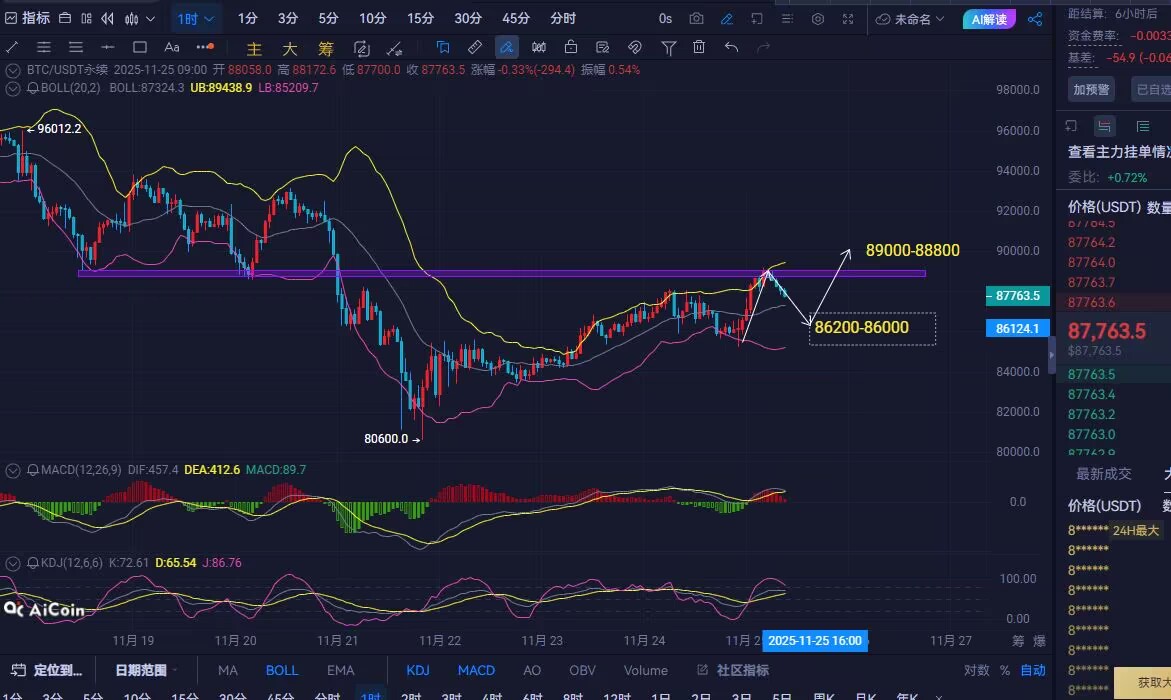 建议比特币88000-88500附近空单进场,目标86600-86200附近