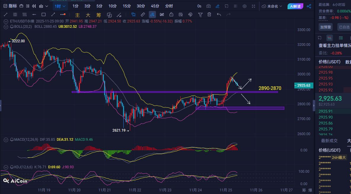 目前从盘面来看, 1小时的以太处于上涨趋势,但成交量的极度缩量与上方巨大压力使得市场短期内存在一定的回调风险,我们需要关注的是1小时中轨2890~2870的关键支撑位,一旦跌破,可能会引发更深幅度的调整