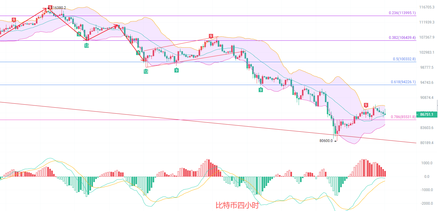 日K线发稿前最高88500,最低86000,EMA趋势指标向下交替扩散以后得大空趋势来到了尾盘,EMA15趋势快线已经跌破了92000来到了91800还在继续走低,MACD缩量减少,DIF和DEA收缩以后有金叉的苗头出现,布林带下轨背离81000,中轨关注95000,现在的价格位于中心横盘区,主力在上方选择方向,所以短线思路不变