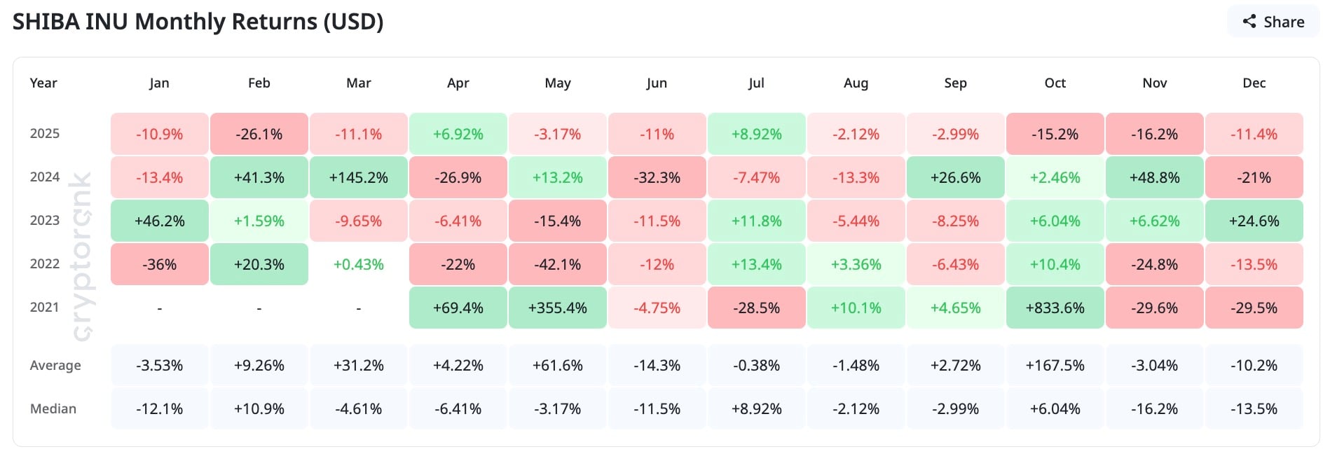 一月交易相关的原因在于SHIB在其他年份有剧烈的月度波动历史,包括2024年2月的+41.3%和3月的+145.2%,甚至2023年1月的+46.2%。