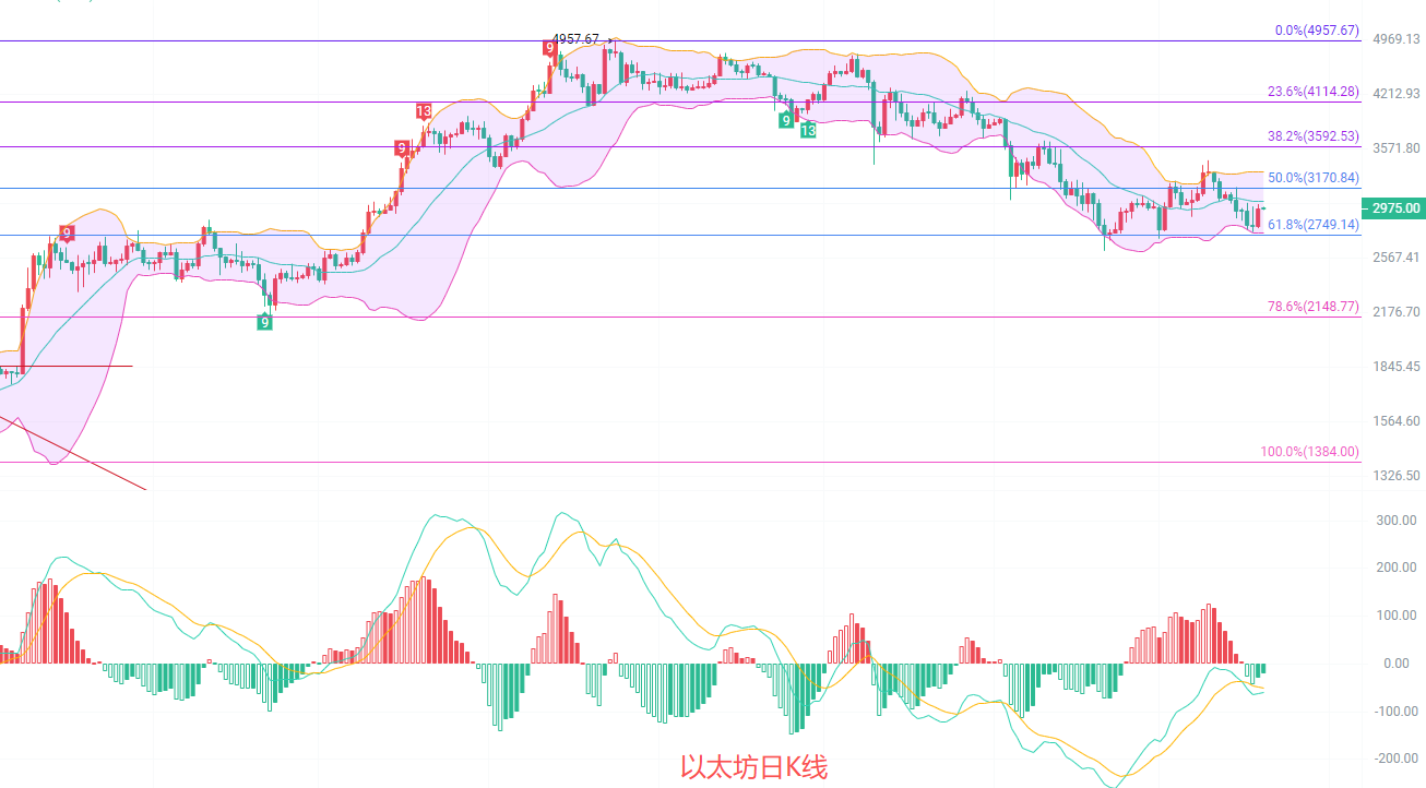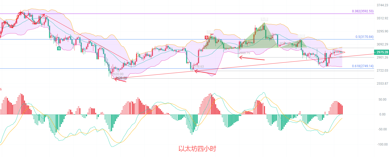 四小时K线三角收缩,波动越来越小,MACD放量减少,K线受罪EMA30一线3960,DIF和DEA形成两级分化,有回调走南的需求存在,布林带上轨关注3050,中轨2915,下轨参考2775,短线关注主力会不会破下方支撑2915,若破位走南,行情大概率会再一次试探箱底的强弱,就是看北的机会