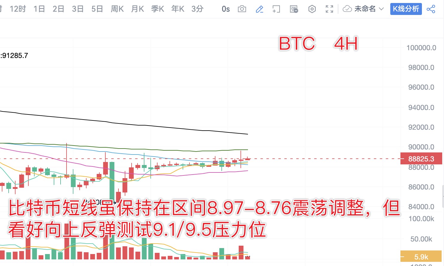 BTC :8.85多,回踩8.78加仓多,目标8.95/9.1;空单等9.2/9.5上方再考虑