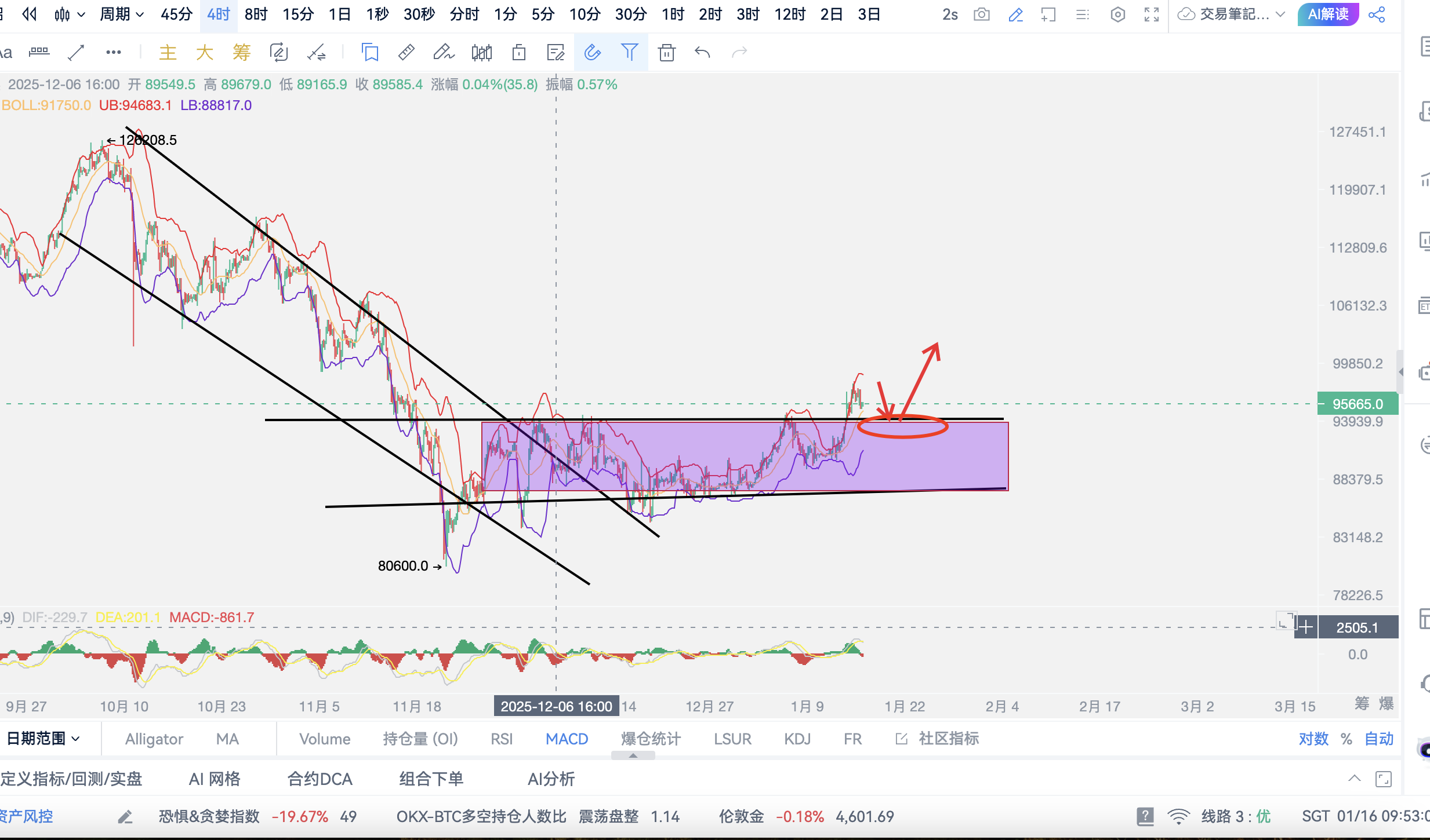 那么今天怎么做,还是回踩看涨,可以围绕回调94950-94500区域看多,目标分批98000破位那就是看十万