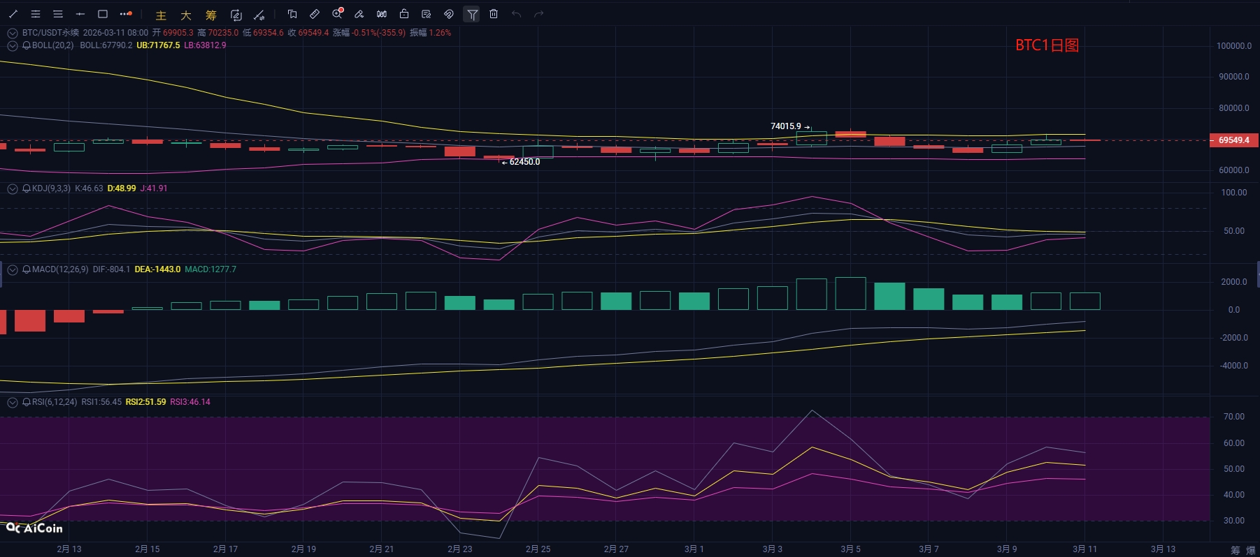 比特币昨日晚间承压下行,走出回调动作,日内白盘行情围绕70000一线附近震荡运行。从日线图来看,比特币日线仍处于区间震荡蓄力阶段,价格运行在布林带中轨与上轨之间,布林带收口短期波动收窄。KDJ指标三线在50附近走平,多空博弈仍在继续;MACD指标中DIF线在DEA线上方运行,绿柱持续缩短,空头动能逐步衰减,多头力量正在积蓄;RSI指标在50-60区间徘徊,市场情绪偏向中性。整体来看,日线级别处于震荡蓄力状态,短期大概率维持区间整理,中期需关注能否有效突破布林带上轨压力,若突破则有望打开上行空间。