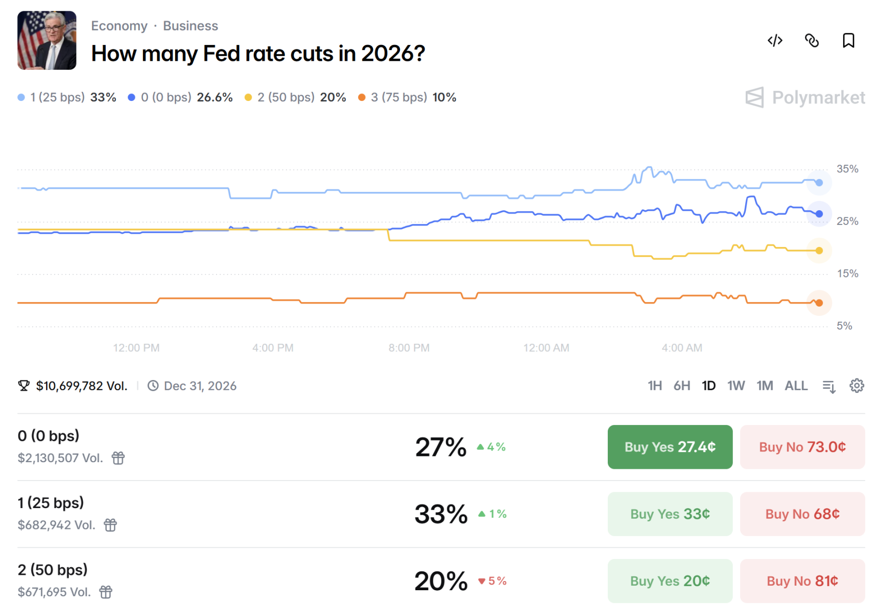 Polymarket 最新数据,目前市场押注美联储今年按兵不动的概率为 27% ,小幅上升 4% ,降息 1 次 25 个基点的概率为 33% ,降息 2 次共 50 基点的概率降至 20% 。