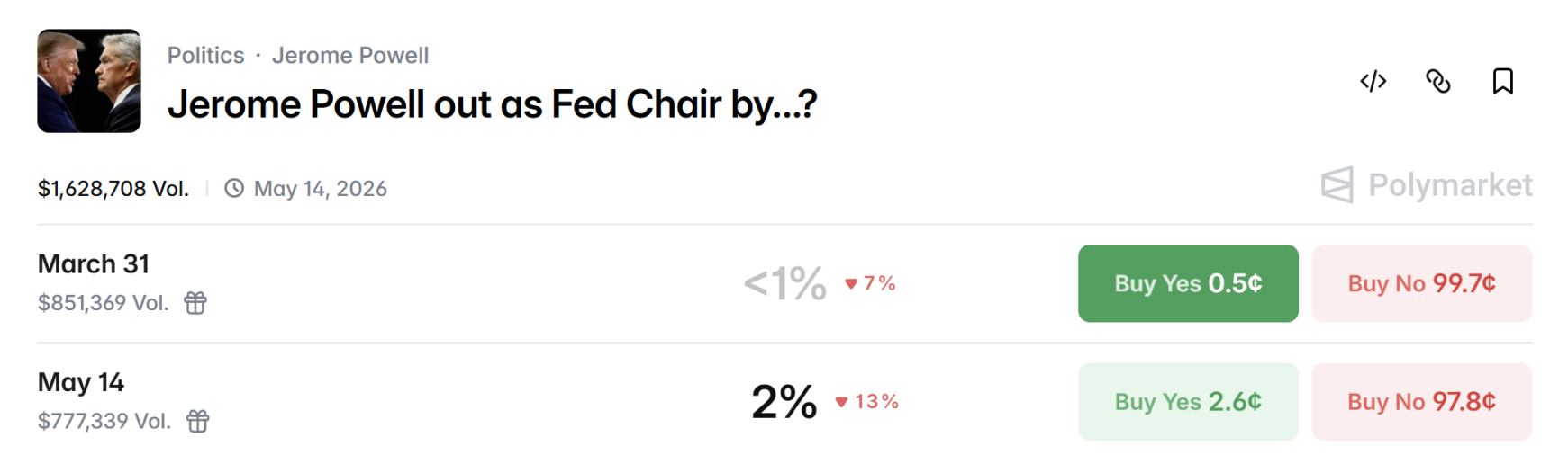 目前, Polymarket 最新数据显示,市场押注其 5 月离任的概率仅为 2% 。