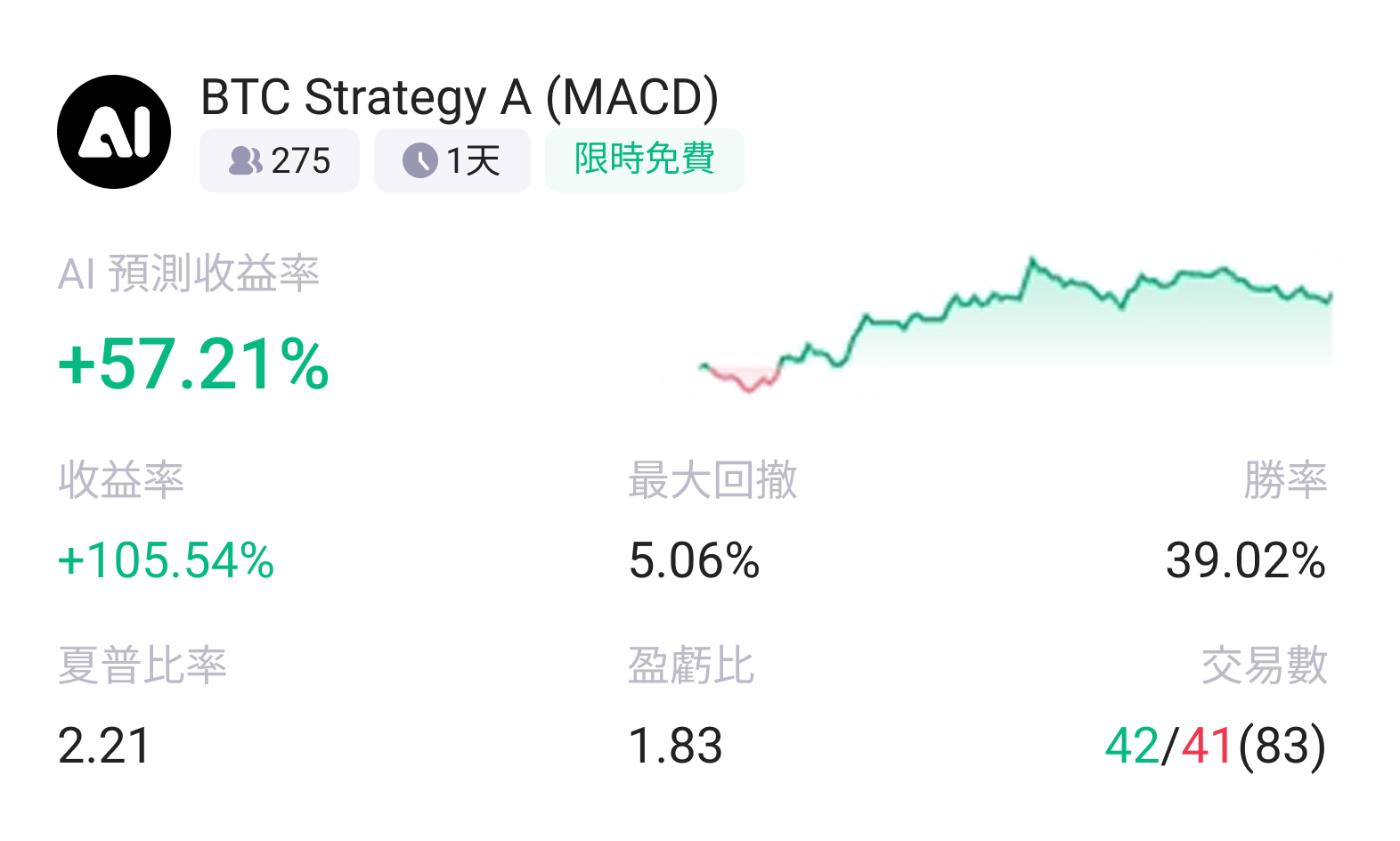 该 BTC 策略依托 MACD 指标构建,在主流币种策略中展现出良好的收益增强能力与风险控制水平,收益表现稳健且波动可控,整体风险收益比优异,适合作为 BTC 配置的辅助增强策略,能在控制回撤的前提下有效捕捉行情机会。